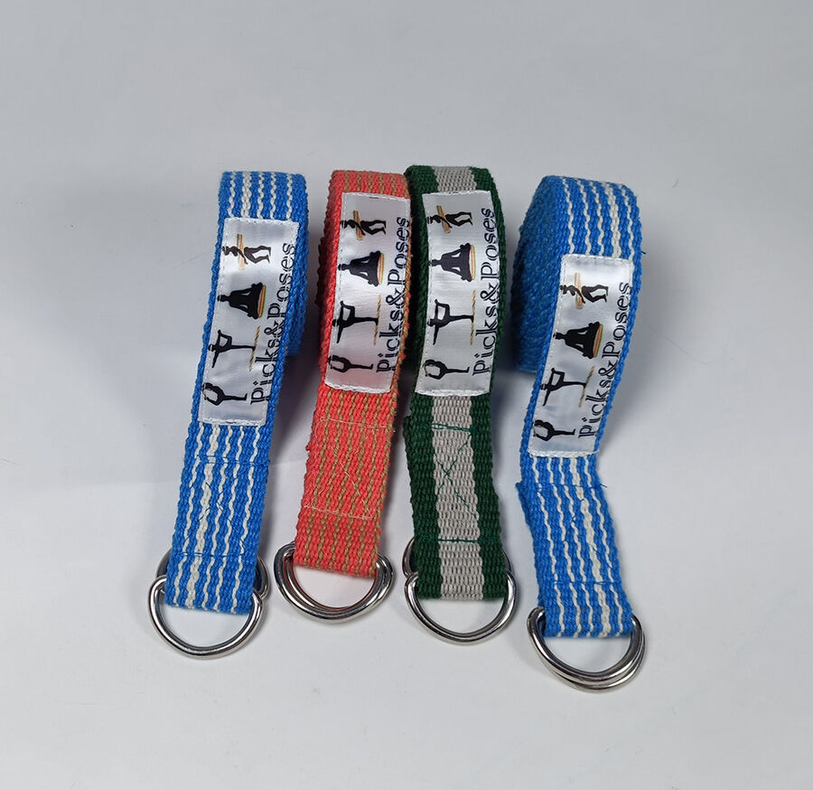 A yoga strap can be used to support a pose or help stretch muscles. This one is handwoven in cotton, strong, non stretching, and with two white metal nickel-free D-rings to lock each loop.