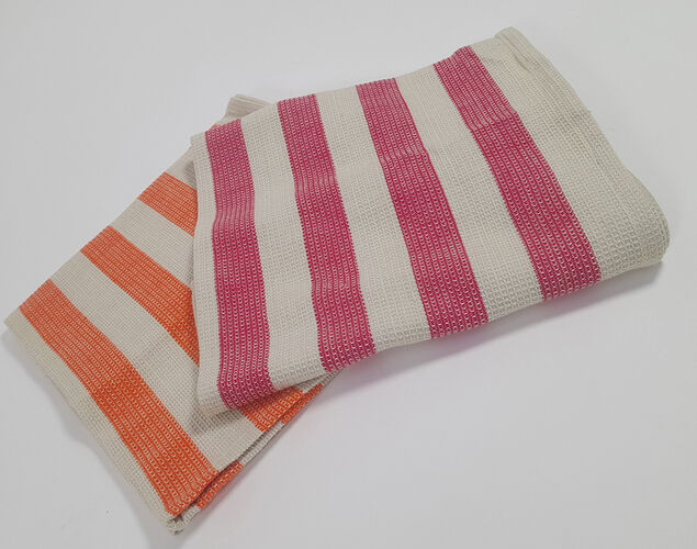 New fresh colours for textured, organic cotton tea towels. These are hand woven in a S. Indian workshop committed to employing people with disabilities or affected by leprosy.