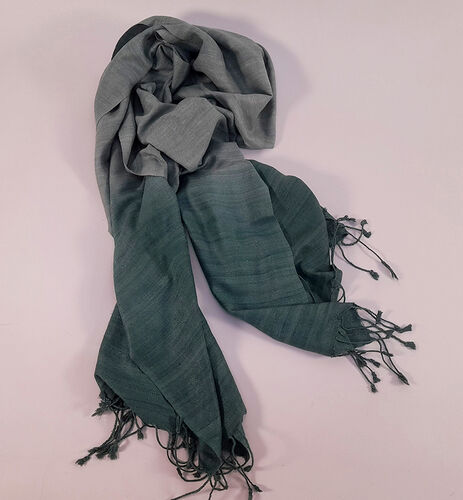 The subtle shading from dark green to light green of this lovely eri silk scarf is called ombré, it is achieved by acarefully timed, hand dipping dye process.
