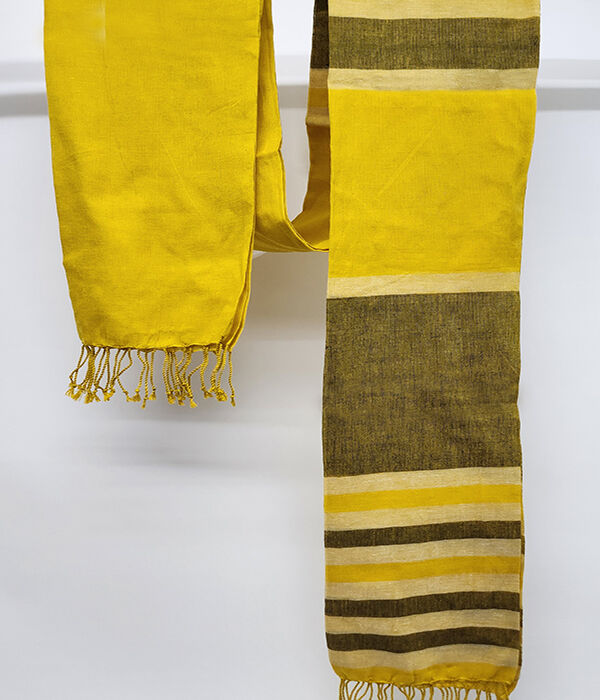 The scarf is hand woven in organic cotton by weavers in a south Indian workshop committed to employing people with disabilities.