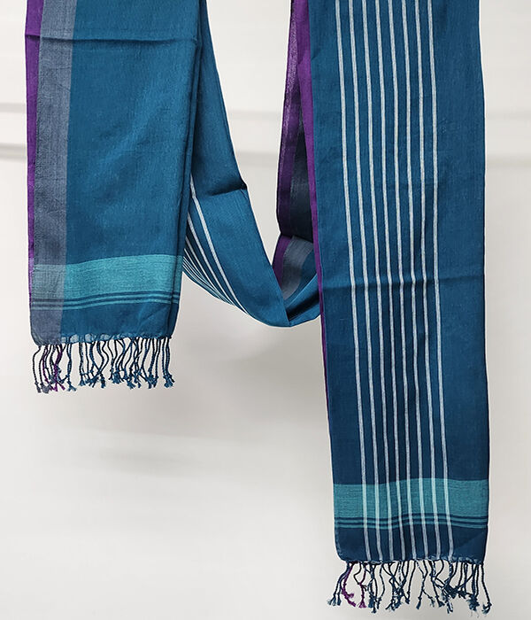 Dark teal and purple fine cotton scarf draped over mannequin.