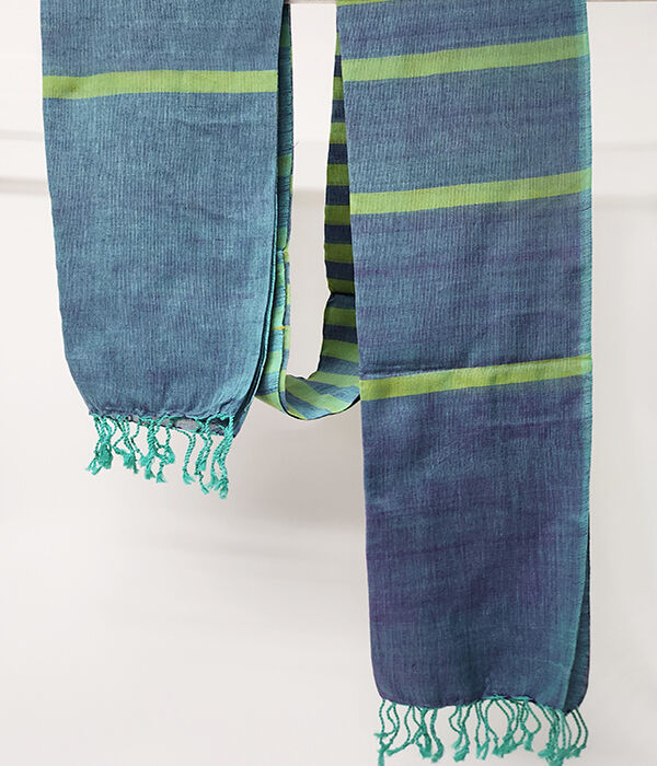 The scarf is hand woven in organic cotton by weavers in a south Indian workshop committed to employing people with disabilities.