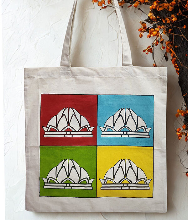 You don't have to be a fan of the Lotus Temple in Delhi to enjoy the vibrant colours of this hand painted cotton tote bag. A great size for daily use and very reasonably priced, these bags have been made by men and women with disabilities in a great rehabilitation training unit near Varanasi, India.