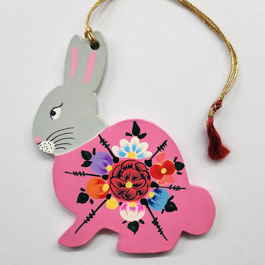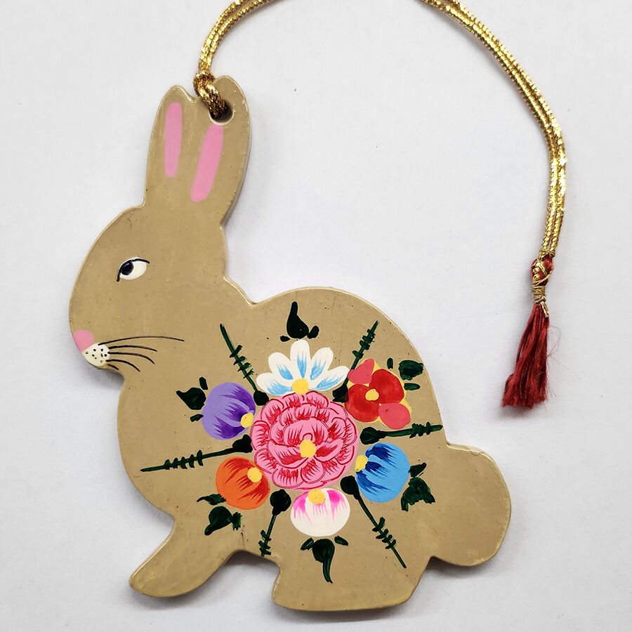 This Easter Bunny Hanging is made of MDF board andthen hand painted by an artists with disabilities living in Kashmir. Each piece is painted free-hand meaning they will all be unique. They are available in three colours, darklilac; brown; pink and grey.