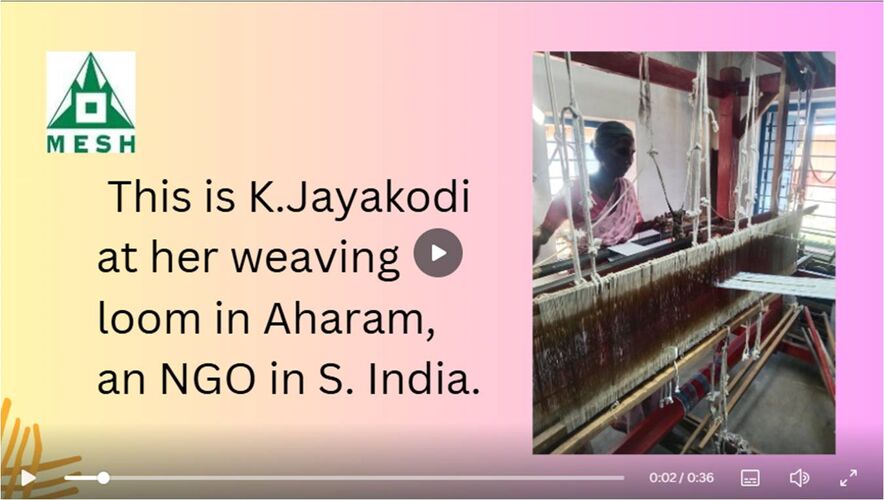 Meet K. Jayakodi who has been able to raise her three daughters alone because she works as a weaver in Aharam an NGO in Tamil Nadu that supplies MESH with organic cotton hand woven products for export around the world.